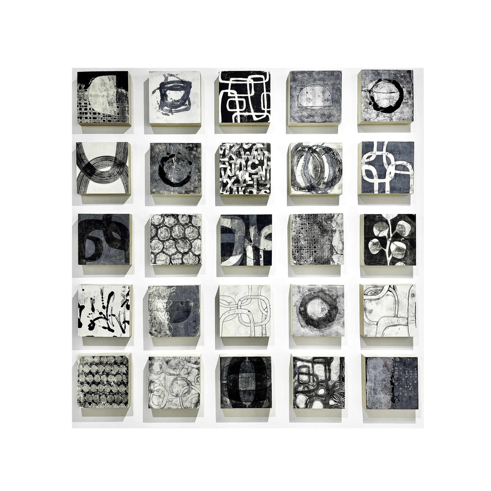 8x8 One of a kind monotype made with acrylic paint, ink, etc. and mounted on a gallery depth wood panel ready to hang. Designed to be displayed unframed, they can stand alone or be grouped for a striking, evolving composition.