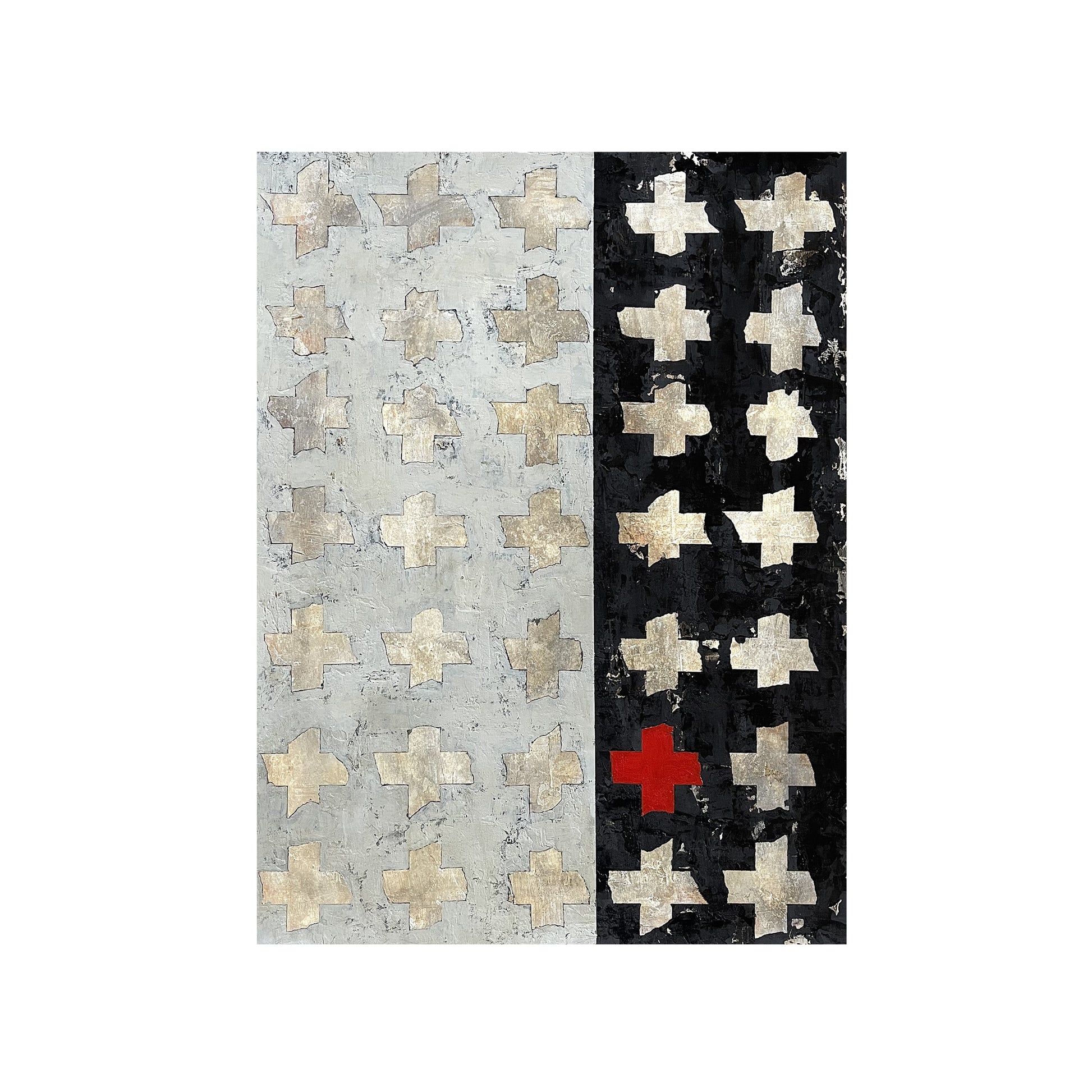 The piece is comprised of collage and hand painted papers and tissue layered on a painted background. Each piece is sealed with varnish and layers of cold wax that have been buffed to a gorgeous matte finish and signed on the back.